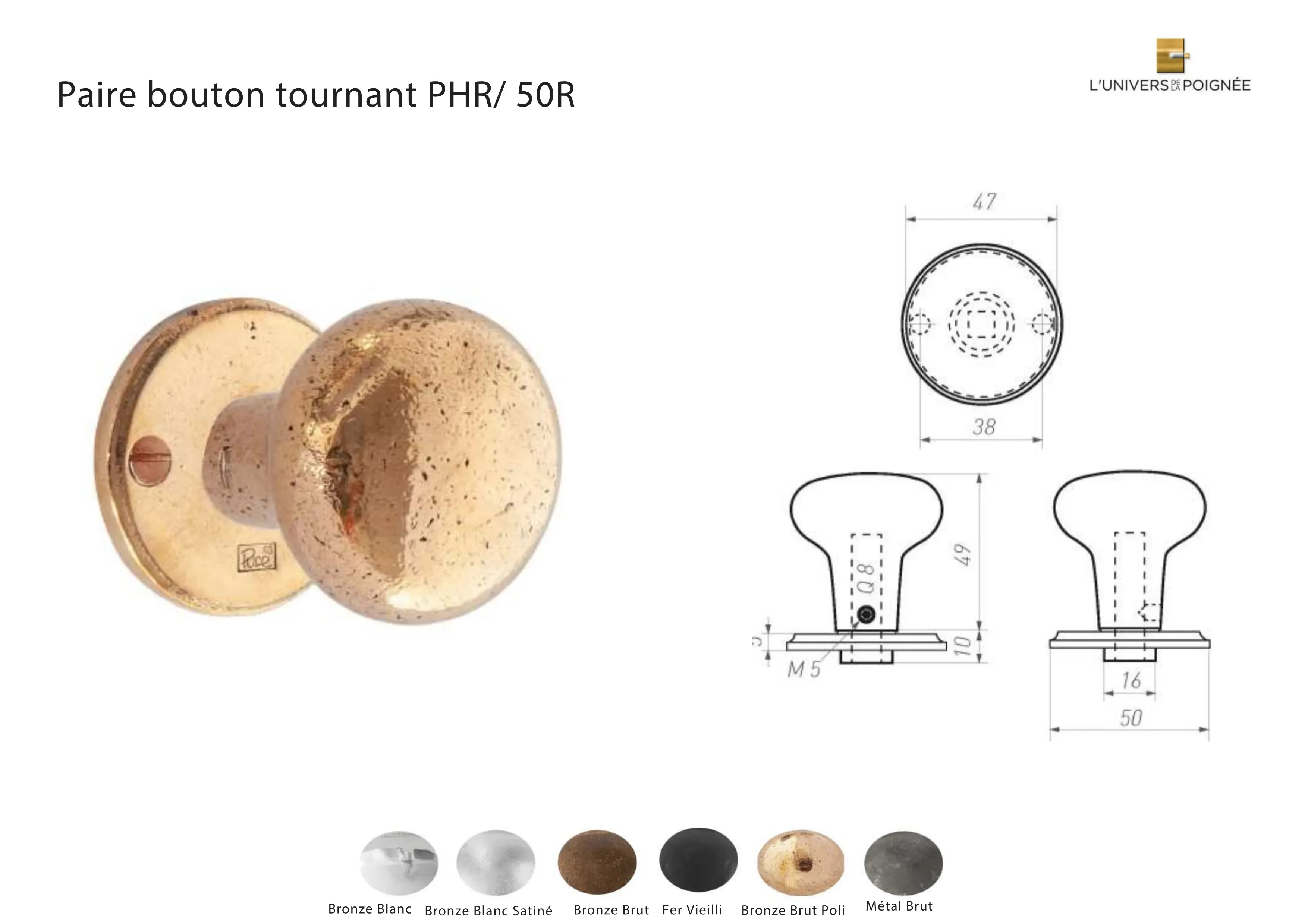 Disponible en 6 finitions possibles, cette collection s’adapte à divers styles et ambiances, offrant une touche de raffinement et de modernité à chaque pièce : Fer vieilli ; Métal brut ; Bronze blanc ; Bronze blanc satiné ; Bronze brut ; Bronze brut poli